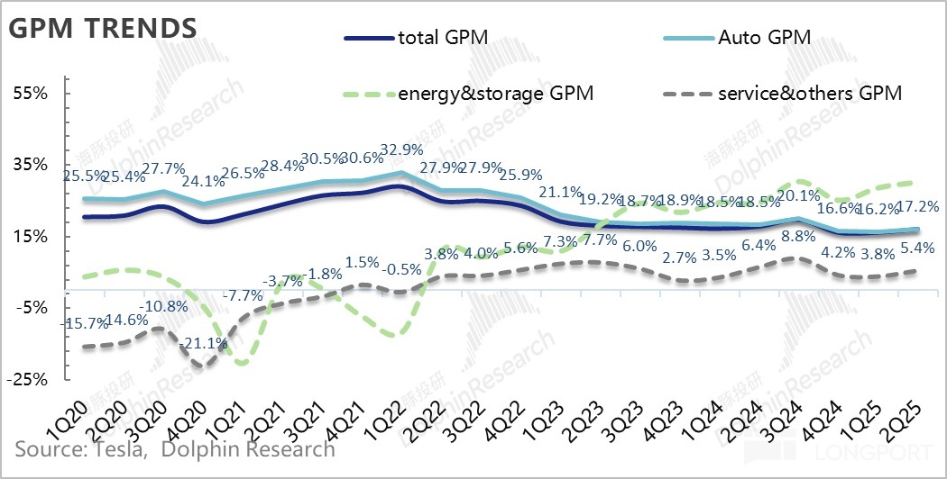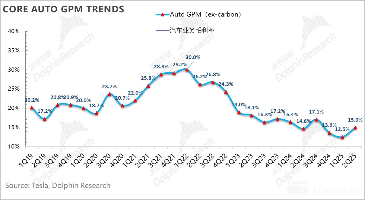 3. 賣車毛利率同樣因為Juniper的上市漲價,及規模效應的改善,終於也開始環比回升了:二季度汽車銷售毛利率(剔碳積分和租賃)15%,環比改善了2.5個百分點,仍然主要由於二季度的Model Y Juniper上市的定價更高,從而帶來更高的賣車單價所拉動。而同時本季度攤折成本因為規模效應的下滑,對沖了關稅效應的不利影響。