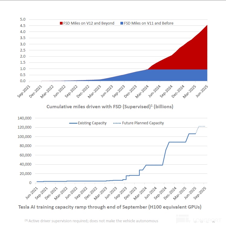 市場仍然在期待軟件端的FSD 14.0版本以及硬件端的HW5.0版本, 而HW 5.0(最新叫AI 5)版本的硬件算力預計達到了2000+ TOPS以上,而相對於現有模型,其支持的FSD 14.0版本的模型參數將達到現在數倍,預計其性能表現會再次躍升一個台階,從而帶動FSD滲透率的提升,以及Robotaxi的繼續擴展。