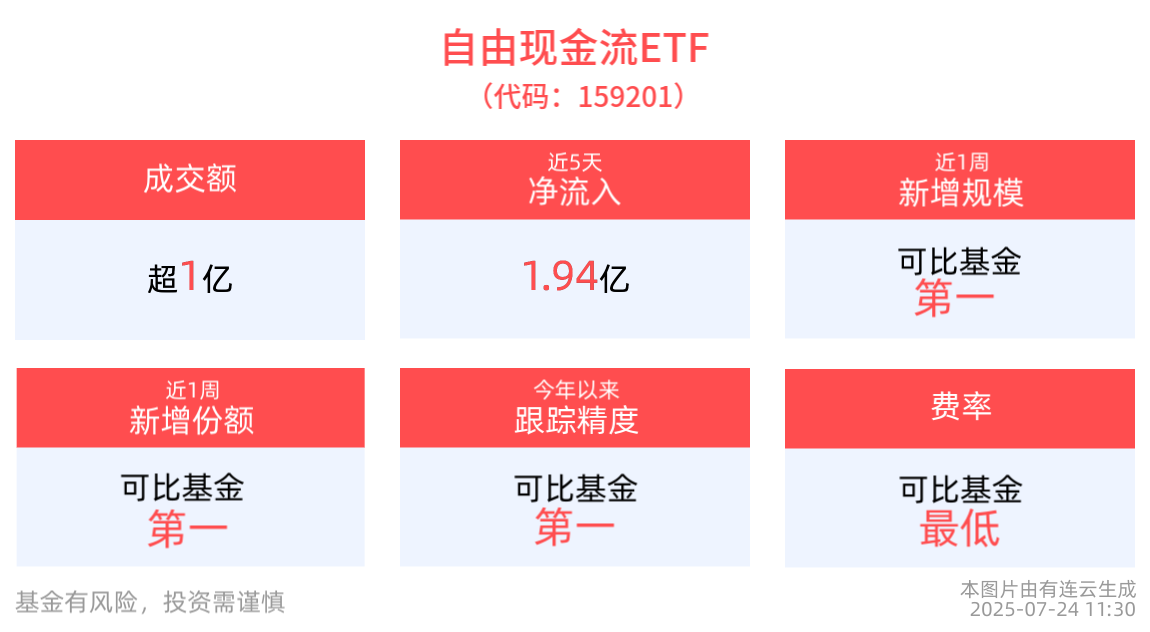 低費率的自由現金流ETF(159201)近5個交易日淨流入1.94億元,最新規模領跑同類産品