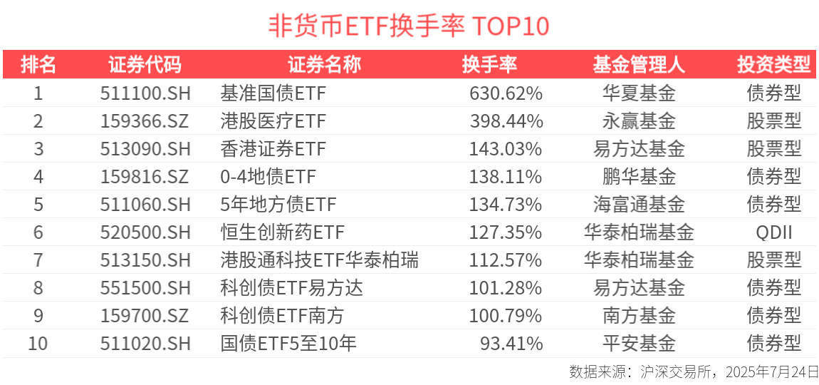 截至今日收盤,基準國債ETF、港股醫療ETF、香港證券ETF換手率居市場前列,分別達630.62%、398.44%、143.03%。行業主題類ETF共計4只,分別是港股醫療ETF、香港證券ETF、恒生創新藥ETF、港股通科技ETF華泰柏瑞。