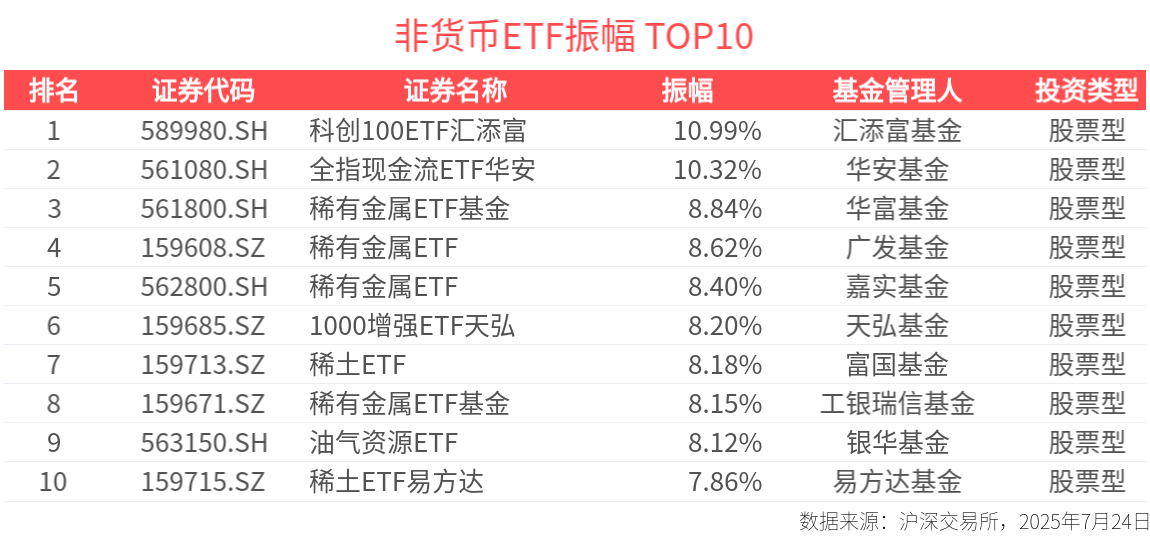 截至今日收盤,科創100ETF匯添富、全指現金流ETF華安、稀有金屬ETF基金振幅居市場前列,分別達10.99%、10.32%、8.84%。