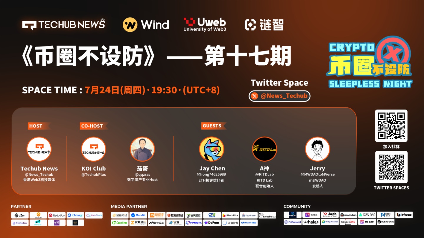 2025年7月24日晚19:30,幣圈不設防第十七期準時開播,為區塊鏈行業帶來了一場思想的饕餮盛宴。在Techub News主持人Jessica與數字資産專業主持人茄哥的引導下,ETH極客信仰者Jay Chen、RITD Lab聯合創始人A神、M&W DAO發起人Jerry齊聚一堂,聚焦近期熱點話題,圍繞區塊鏈技術革新、監管趨勢以及生態共建等方面展開了深入探討。本期節目以透明化建設為核心,打破了信息壁壘,讓市場洞見相互碰撞,為Crypto領域的未來發展點燃了新的火花。以下是這場如同“達沃斯圓桌”式對話的精彩回顧。