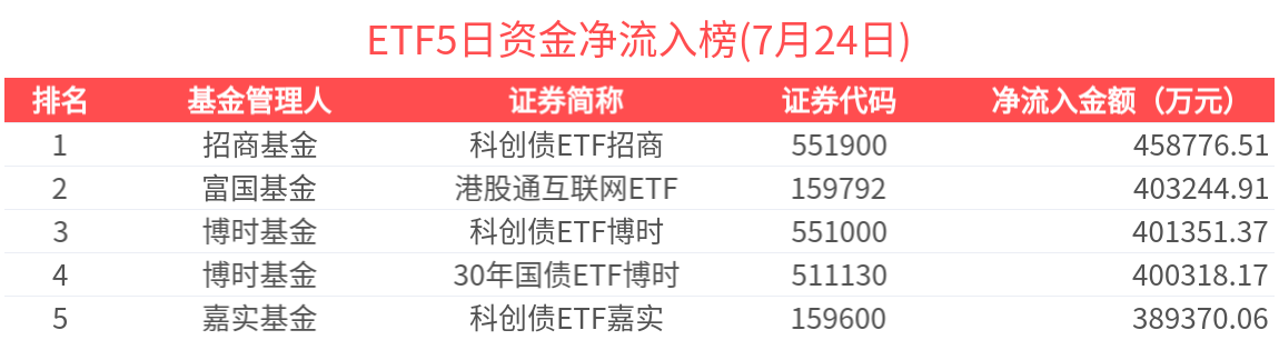 拉長時間看,近5天累計淨流入超過1億元的有91只,金額居前的為科創債ETF招商、港股通互聯網ETF、科創債ETF博時、30年國債ETF博時、科創債ETF嘉實等,分別淨流入45.88億元、40.32億元、40.14億元、40.03億元、38.94億元。其中,科創債ETF招商近5天資金大幅淨流入,基金規模快速增長至105.63億元。