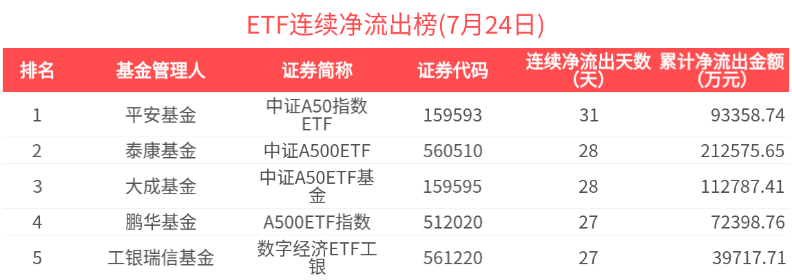 連續淨流出的ETF基金有344只,居前的為中證A50指數ETF(31天)、中證A500ETF(28天)、中證A50ETF基金(28天)、A500ETF指數(27天)、數字經濟ETF工銀(27天),分別淨流出9.34億元、21.26億元、11.28億元、7.24億元、3.97億元。其中,中證A50指數ETF近31天加速流出,近31天累計流出9.34億元,基金規模快速下降至65.55億元。