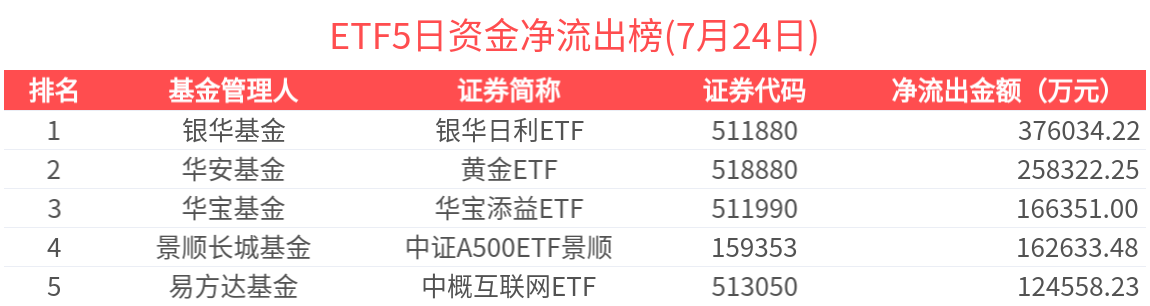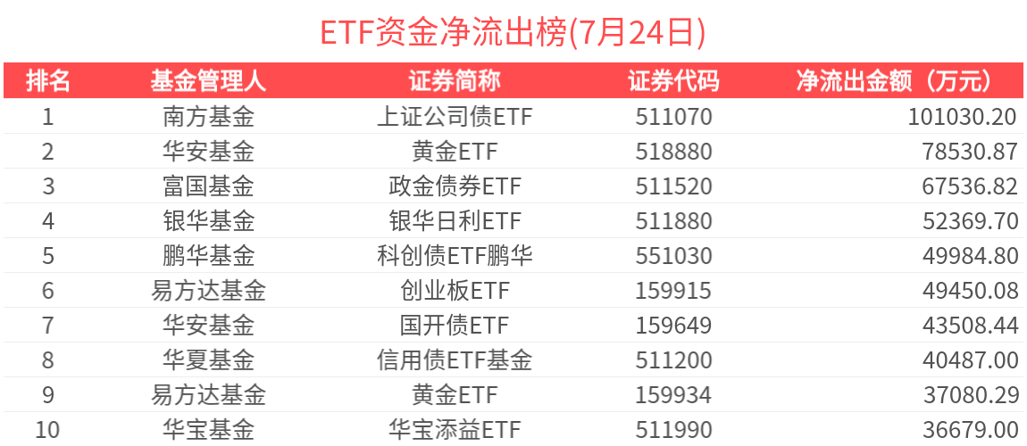 2025年7月24日共257只ETF基金獲資金淨流入,505只ETF基金淨流出。淨流入金額超1億元的有37只,滬深300ETF(510300.SH)、中證1000ETF(512100.SH)、科創債ETF南方(159700.SZ)、30年國債ETF博時(511130.SH)、可轉債ETF(511380.SH)資金顯著流入,分別淨流入12.77億元、12.02億元、11.62億元、9.74億元、9.65億元(淨申購份額*單位淨值)。