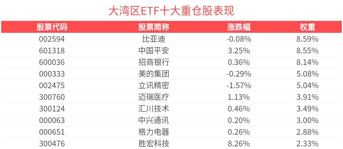 數據顯示,截至2025年6月30日,中證粵港澳大灣區發展主題指數(931000)前十大權重股分別為比亞迪(002594)、中國平安(601318)、招商銀行(600036)、美的集團(000333)、立訊精密(002475)、邁瑞醫療(300760)、匯川技術(300124)、中興通訊(000063)、格力電器(000651)、TCL科技(000100),前十大權重股合計佔比51.52%。