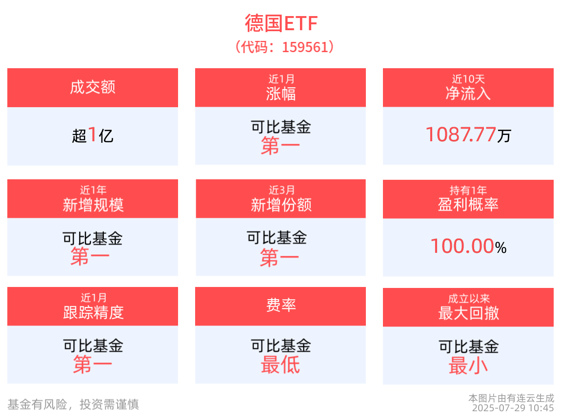跟蹤精度方面,截至2025年7月25日,德國ETF近1月跟蹤誤差為0.008%,在可比基金中跟蹤精度最高。