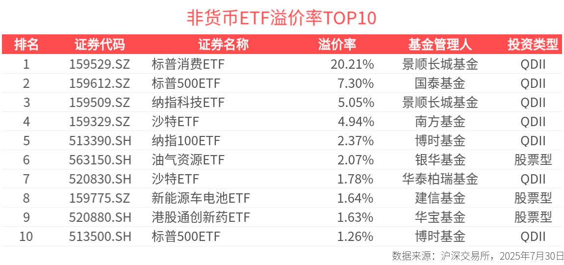 截至今日收盤,標普500消費精選指數溢價居前,標普消費ETF收盤溢價20.21%;標普500指數情緒高漲,標普500ETF收盤溢價7.30%。