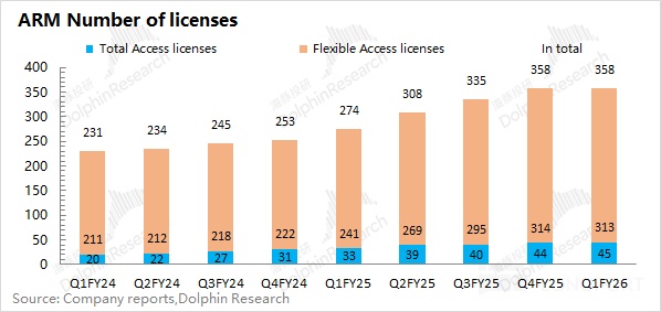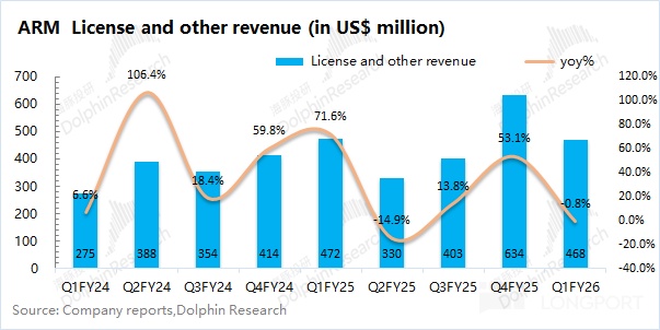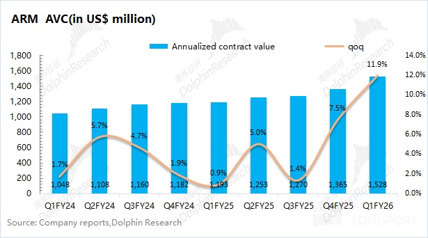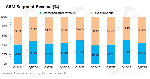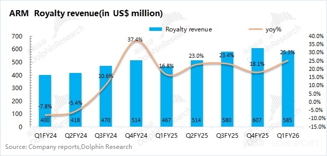 ARM 的版稅授權業務在 2026 財年第一季度(即 25Q2)實現營收 5.85 億美元,同比增長 25.3%。