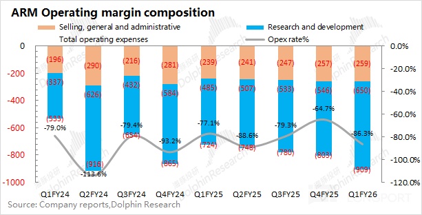 ARM 在 2026 財年第一季度(即 25Q2)的經營費用為 9.1 億美元,同比增長 25.6%,本季度公司再次加大了對研發的投入。本季度經營費用率達到了 86.3%,這直接擠壓了公司的利潤率。