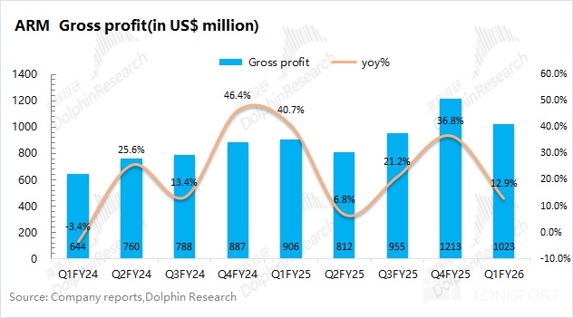 ARM 在 2026 財年第一季度(即 25Q2)實現毛利 10.2 億美元,同比增長 12.9%。本季度的毛利率為 97.2%,同比提升 0.7pct。由於公司毛利率長期維持在 95% 以上,因而毛利表現整體與收入端相近。
