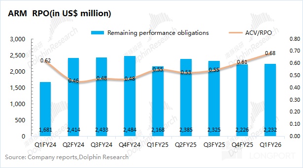 ARM 的許可證業務在 2026 財年第一季度(即 25Q2)實現營收 4.68 億美元,同比下滑 0.8%。其中本季度有 3 筆 CSS 許可證升級,一部分收入計入本季度,其餘部分計入剩餘未完成訂單中。