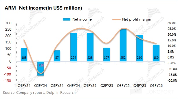 ARM 在 2026 財年第一季度(即 25Q2)實現淨利潤 1.3 億美元,同比環比都明顯下滑,低於市場預期(1.87 億美元)。公司毛利率相對穩定,本季度大幅增加了研發支出,這直接將淨利率被擠壓至 12.3%。