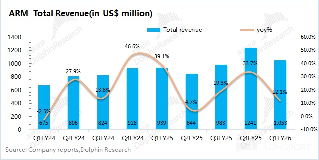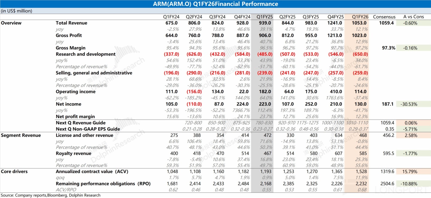 ARM 在 2026 財年第一季度(即 25Q2)實現營收 10.53 億美元,同比上升 12.1%,接近市場預期(10.59 億美元)。主要增量來自於版稅業務,本季度版稅業務同比增長 25%,而許可證業務出現回落。