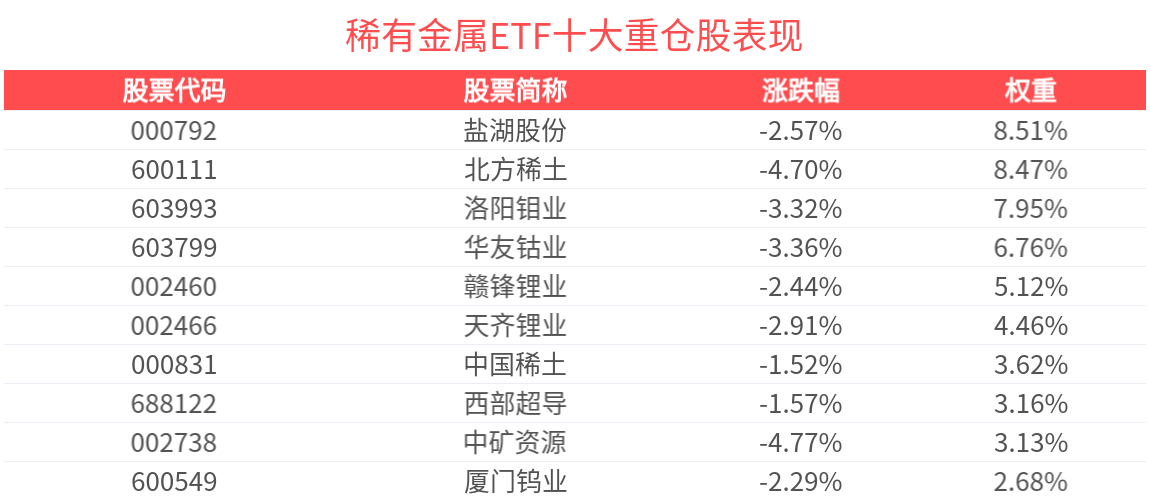 數據顯示,截至2025年6月30日,中證稀有金屬主題指數前十大權重股分別為鹽湖股份、北方稀土、洛陽鉬業、華友钴業、贛鋒鋰業、天齊鋰業、中國稀土、西部超導、中礦資源、廈門鎢業,前十大權重股合計佔比54.07%。