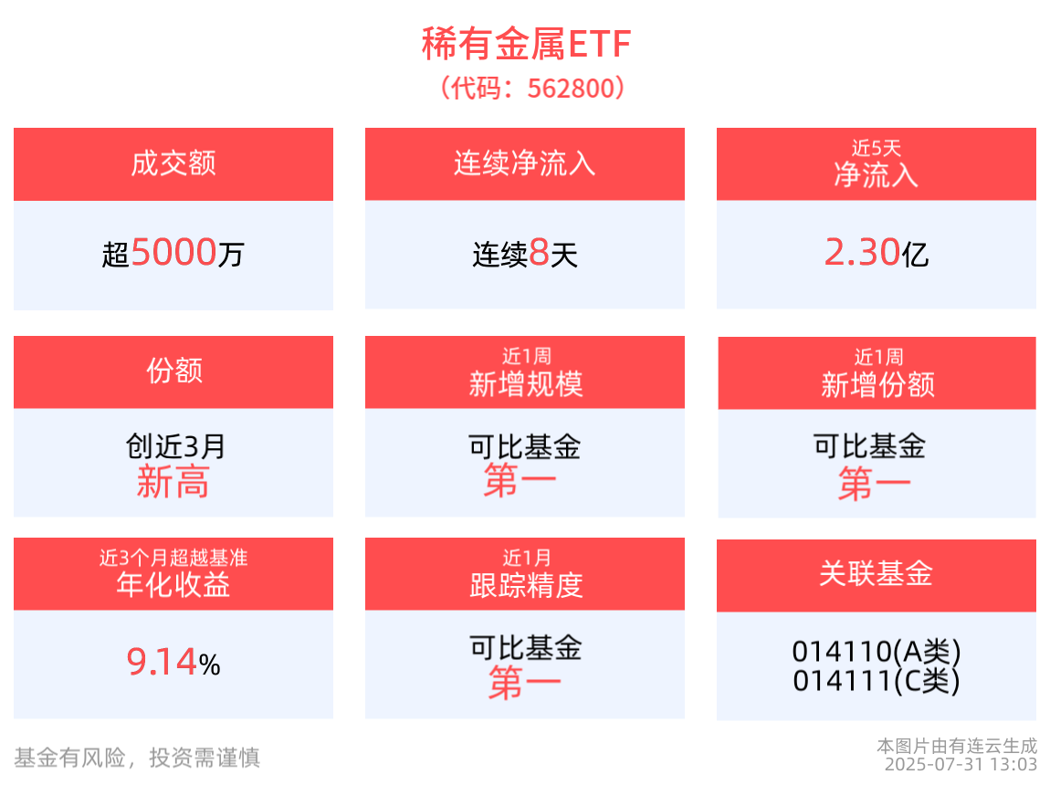 截至7月30日,稀有金屬ETF近1年淨值上漲59.19%,指數股票型基金排名280/2941,居於前9.52%。從收益能力看,截至2025年7月30日,稀有金屬ETF自成立以來,最高單月回報為24.02%,最長連漲月數為3個月,最長連漲漲幅為14.06%,上漲月份平均收益率為7.76%。截至2025年7月30日,稀有金屬ETF近3個月超越基準年化收益為9.14%。