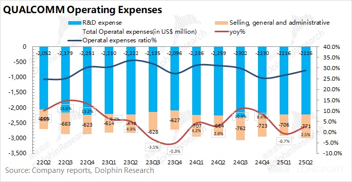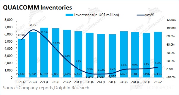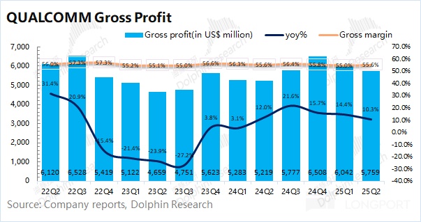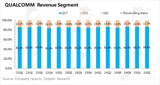 4、下季度指引:高通預期 2025 財年第四季度營收 103-111 億美元,區間中值環比增長 3.2%,市場預期 105.8 億美元;公司預期下季度的 Non-GAAP 每股利潤為 2.75-2.95 美元,市場預期 2.83 美元。隨著下季度進入將進入年末旺季備貨期,公司業績將有所好轉。