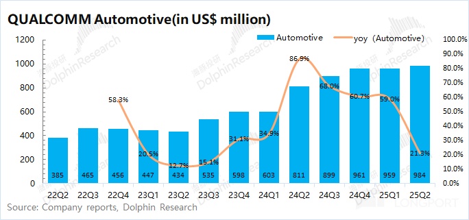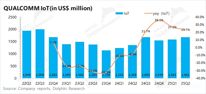 1、核心數據:$高通(QCOM.US) 本季度收入 103.6 億美元,同比增長 10.3%,符合市場預期(103.3 億美元)。其中公司的手機業務回暖較弱,IoT 和汽車業務增速都在 20% 以上。公司本季度毛利率 55.6%,同比持平,略好於市場預期(55%)。公司本季度毛利率一般是年内相對低點,隨著下遊進入旺季,毛利率將有所回升。