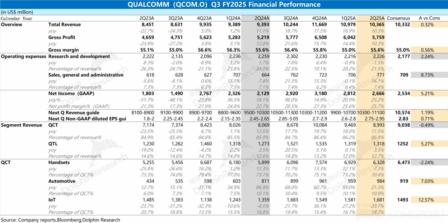 高通(QCOM.O)於北京時間 2025 年 7 月 31 日上午的美股盤後發佈了 2025 財年第三季度財報(截止 2025 年 6 月),要點如下: