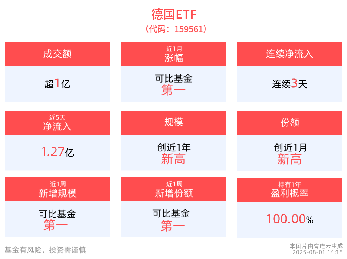 截至2025年7月31日,德國ETF(159561)近3月累計上漲7.32%,漲幅排名可比基金第一。流動性方面,截至2025年8月1日14:00,德國ETF盤中換手7.58%,成交1.24億元,市場交投活躍。拉長時間看,截至7月31日,德國ETF近1周日均成交1.95億元。