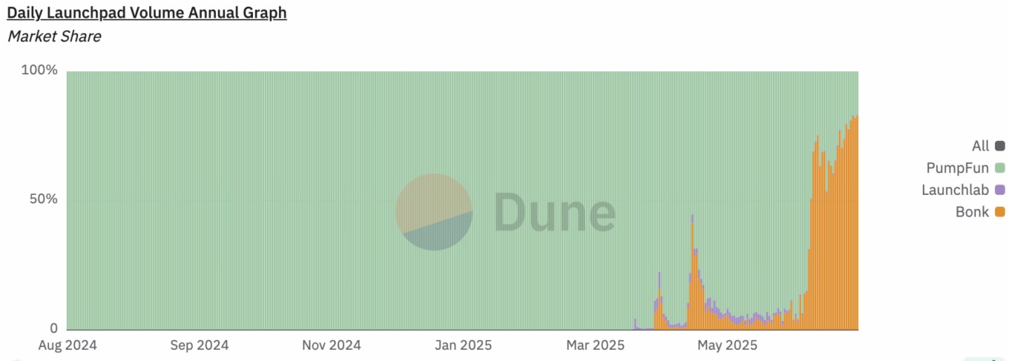 首先,本文并非针对 LetsBonk 的攻击,由 Tom 领导的 Bonk 团队在赢得 Memecoin 的市场份额方面做得非常出色,以至于PumpFun并不值得发起反击。LetsBonk 已经赢得了 memecoin 之战,并将继续在此领域占据主导地位。