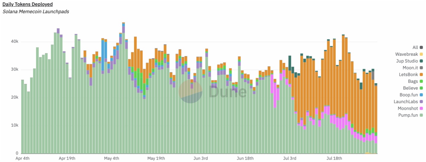 Let'sBonk 目前在代币部署方面领先约 3.7 倍。其在短短一个月内就获得了 65.1% 的市场份额。Let'sBonk 的毕业项目数量约为 PumpFun 的 7.8 倍。PumpFun 每个毕业项目发行的代币数量也远多于 Let'sBonk,这使得 Let'sBonk 成为更有利可图的交易平台。
