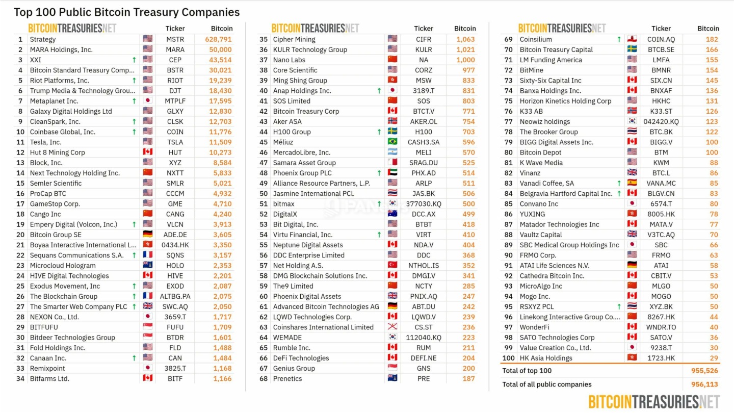 PANews 8月5日消息,數據顯示,當前持倉前100家上市公司共計持有955,526枚BTC,佔比特幣流通量約4.55%。其中MicroStrategy以628,791枚BTC位列榜首,其次為Marathon Digital(50,000枚)及新晉入榜的XXI公司(43,514枚)。過去一周有20家公司增加比特幣持倉,包括Galaxy Digital、CleanSpark、Empery Digital等,加密資産持續作為公司金庫配置的重要方向。