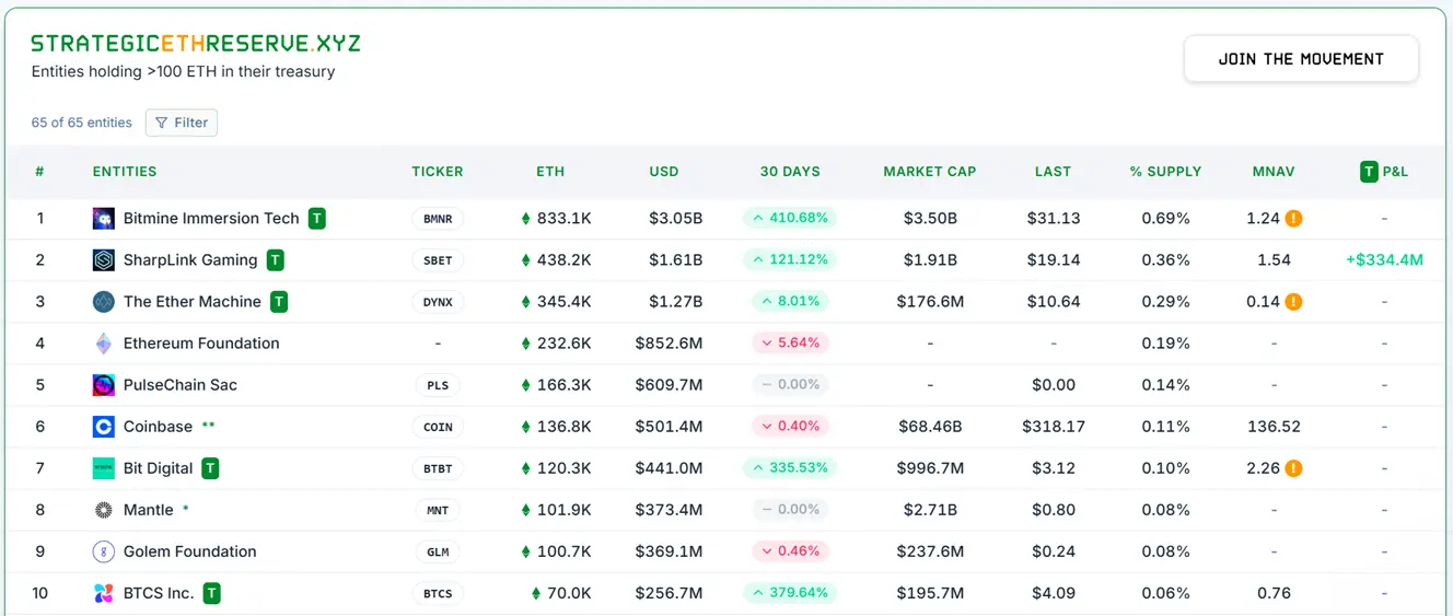 據官方報道顯示,7月21日值ETHM宣佈上市時,BitMine和SharpLink的ETH儲備分別僅為30萬和28萬枚,均低於ETHM計劃的40萬枚初始規模。然而到8月5日,BitMine的持倉量已飙升至83.3萬枚(市值30億美元),其增幅高達177%,一舉奪得頭籌;SharpLink也不甘示弱,據Nansen鏈上數據,其儲備量已達49.8萬枚(市值18億美元),增幅78%,位列第二,並公開宣佈要沖擊100萬枚目標。就連前比特幣礦工Bit Digital也緊急轉向,積累了12萬枚ETH。