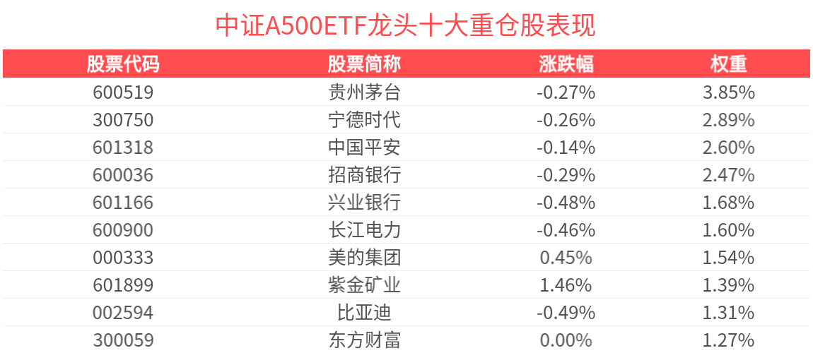 数据显示,截至2025年7月31日,中证A500指数(000510)前十大权重股分别为贵州茅台(600519)、宁德时代(300750)、中国平安(601318)、招商银行(600036)、兴业银行(601166)、美的集团(000333)、长江电力(600900)、紫金矿业(601899)、东方财富(300059)、比亚迪(002594),前十大权重股合计占比19.83%。