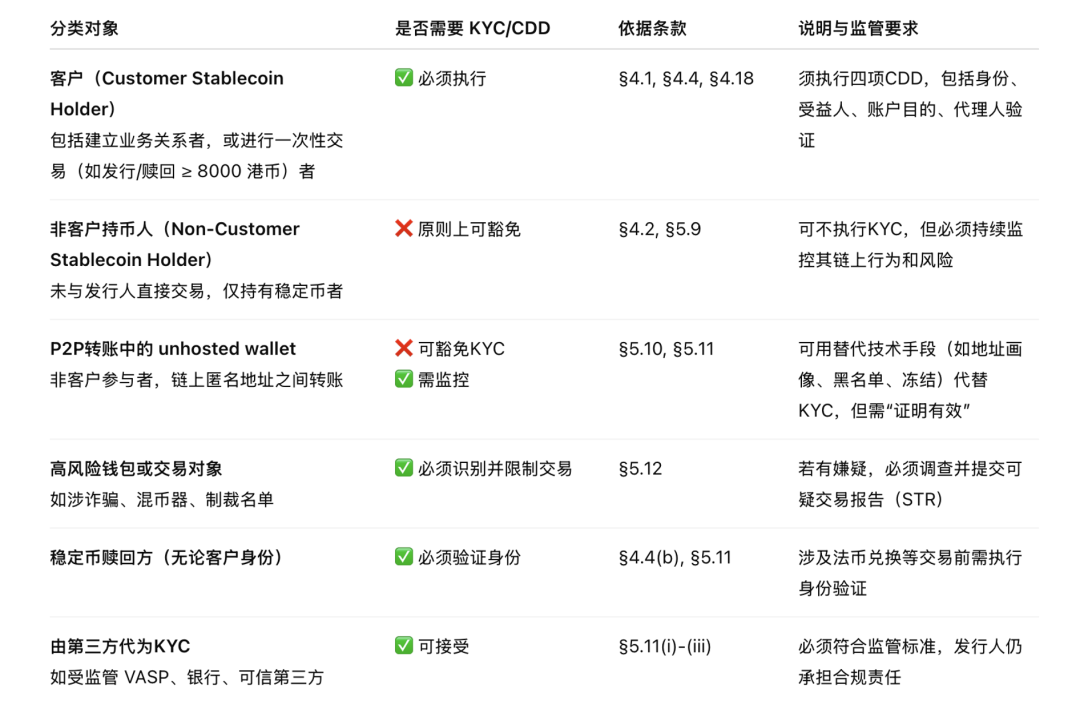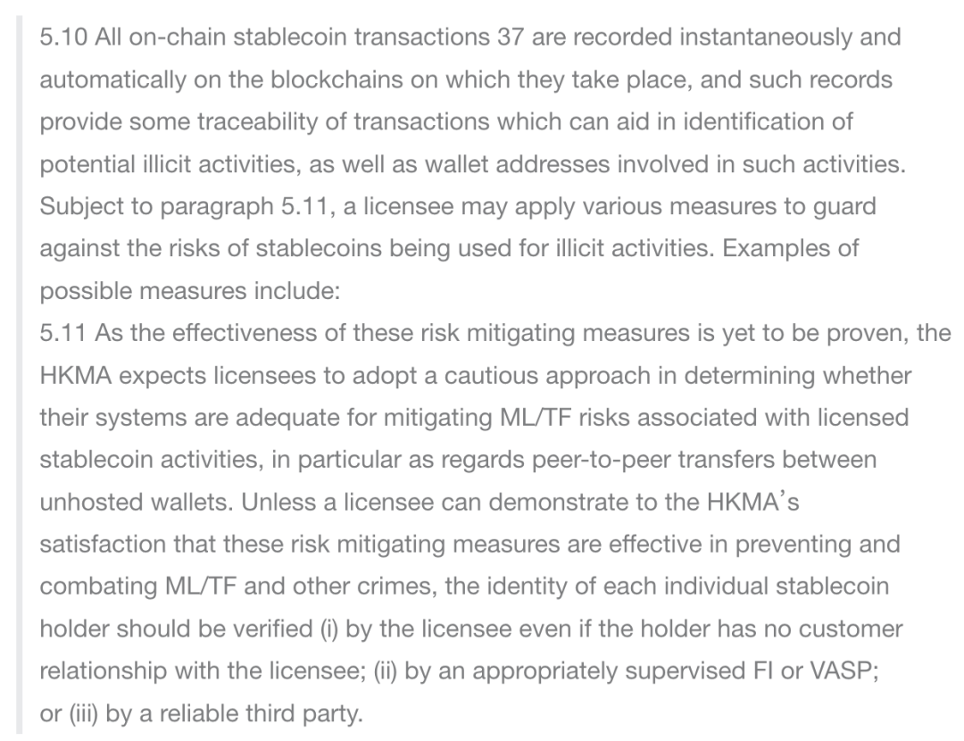 如果發行人採用了諸如區塊鏈分析工具、地址黑名單、交易風險評分、錢包畫像與凍結機制 (5.10)等方式來監控幣的流向和用途,並且能夠讓HKMA“滿意”(to the HKMA’s satisfaction - 5.11),那麼這些技術性風控措施可以作為替代,不必強制對所有持幣人逐一KYC。