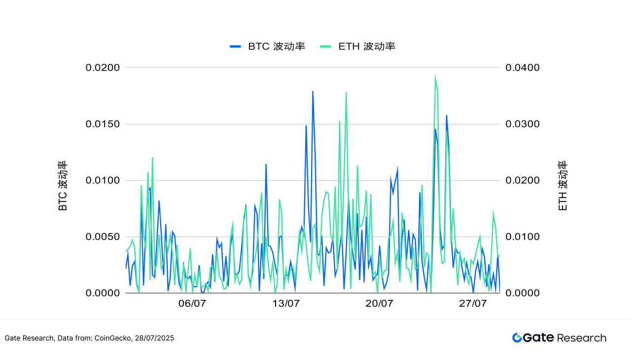 圖二:BTC 波動率整體平穩,ETH 於 7 月中下旬頻繁放大,反映短期交易情緒與方向分歧加劇