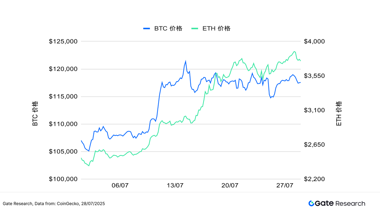 據 CoinGecko 數據,7 月 15 日至 28 日期間,加密市場高位震蕩整理,BTC 與 ETH 均在突破階段高點後進入橫盤區間,短期動能趨於平緩,但整體結構維持多頭格局。