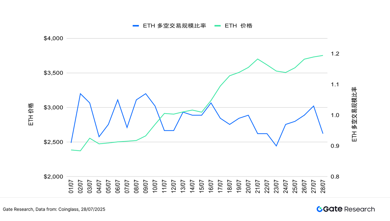 ETH 多空比則呈現出與價格走勢脫鈎的特徵。盡管價格自 7 月 15 日起穩步推升並持續逼近 4,000 USDT,但多空比卻自 7 月中旬起逐步走弱,持續維持在 0.95 附近甚至一度跌破 0.90,顯示市場資金操作相對謹慎,對 ETH 上漲的可持續性或存有疑慮。LSR 連續數日處於偏空水平,反映短綫資金偏好試探性空單,行情雖漲,情緒卻未跟隨同步轉強。