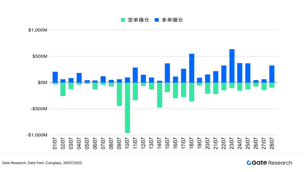 空單爆倉則相對溫和,僅在 7 月 18 日行情強勢上行時出現集中止損放量,其餘時間整體維持低位,反映出空頭資金操作更趨保守,試圖“摸頂”的交易行為未能大規模觸發清算。