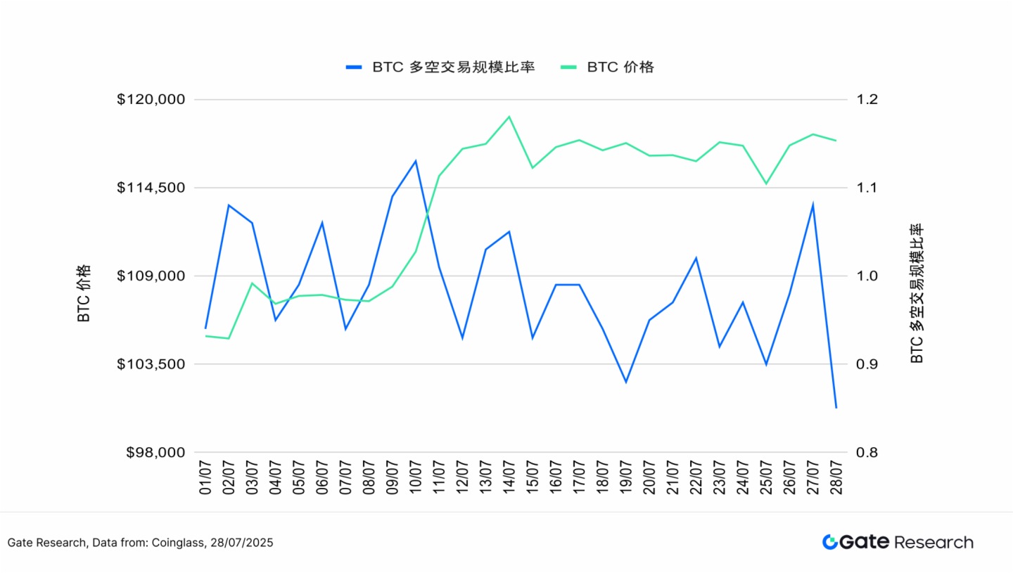 據 Coinglass 數據,BTC 多空交易規模比率(LSR)整體震蕩下行,盡管價格維持在高位區間,但多空比未能持續維持在偏多水位,多次下探至 1 以下,至 7 月 28 日甚至跌破 0.90,反映出市場高位追價意願轉弱,短綫資金更趨保守,顯示盡管 BTC 結構仍強,但行情熱度有所退潮。整體而言,BTC 在刷新高點後的多空比下滑,顯示市場短綫樂觀情緒減弱,部分資金選擇逐步減倉或觀望。【4】