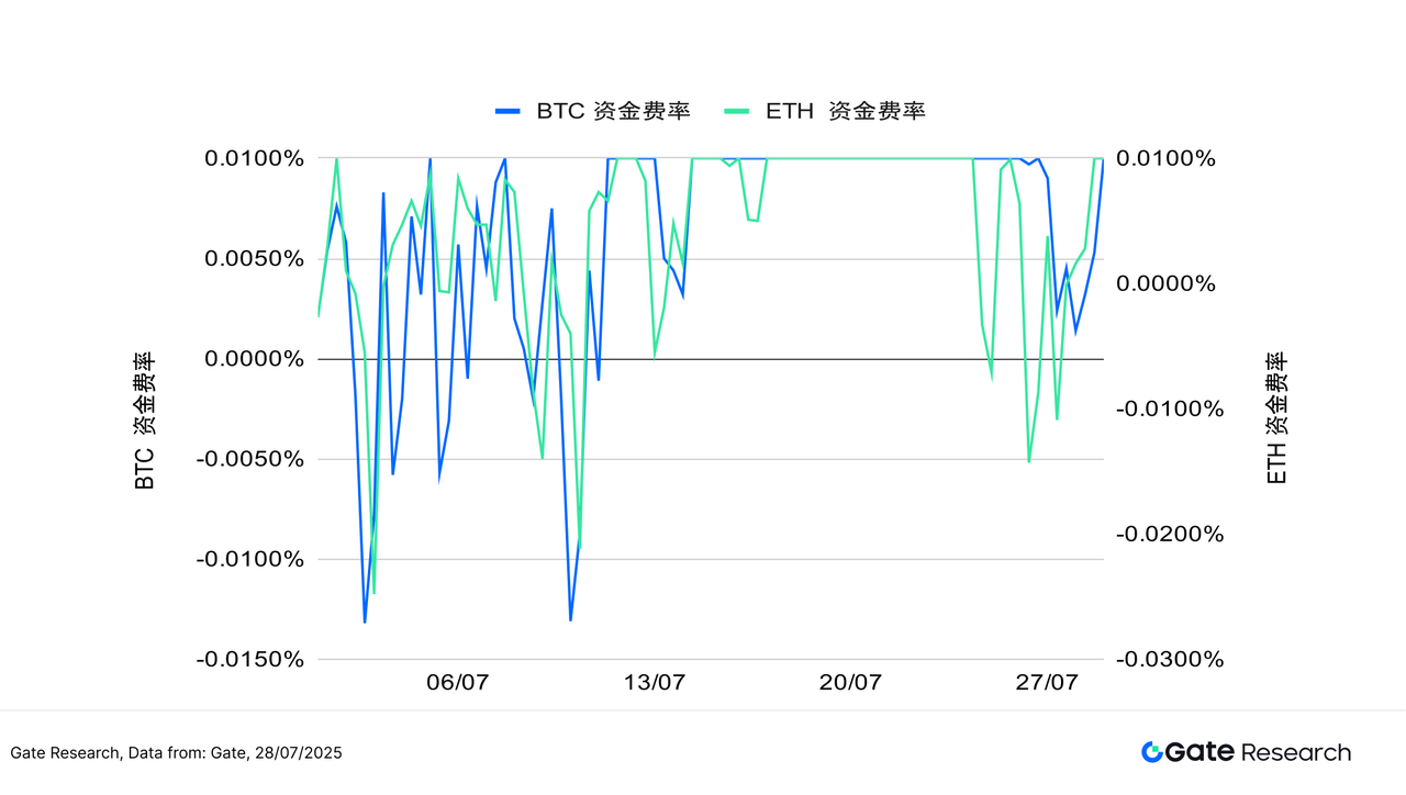 從走勢來看,ETH 資金費率在此期間多次短暫轉負,尤其是在 7 月 24 日至 26 日期間一度深度回落,最低接近 -0.015%,但隨即快速修復,未引發大規模清算或價格反轉,顯示市場整體抗壓性良好。值得注意的是,BTC 的資金費率波動相對較小,穩定性高,顯示機構與穩健資金對其配置仍具偏好;而 ETH 資金費率則波動略高,反映市場對於其後續走勢仍有分歧,操作更偏交易性。
