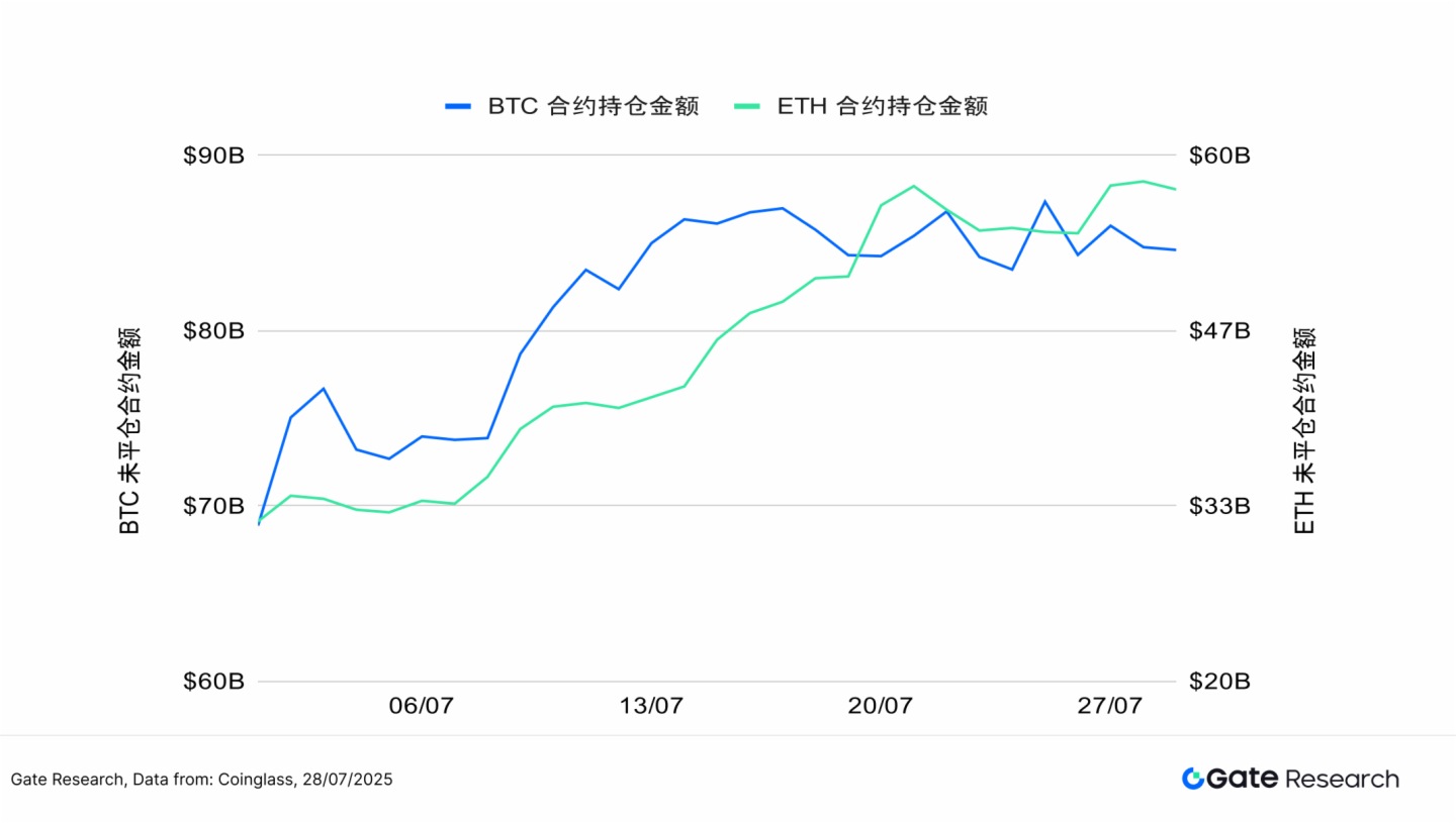 據 Coinglass 數據,BTC 與 ETH 合約持倉金額整體維持高位震蕩,顯示市場槓桿資金在前期積極進場後,短期進入觀望或高位博弈狀態。BTC 合約持倉金額自 7 月中旬以來多次測試 850 億至 880 億美元區間,雖未明顯突破,但整體水位仍維持於近一個月高檔;ETH 合約持倉則持續穩定增長,7 月中旬突破 500 億美元,至 7 月 28 日仍維持在 570 億美元附近,刷新年内新高。【5】