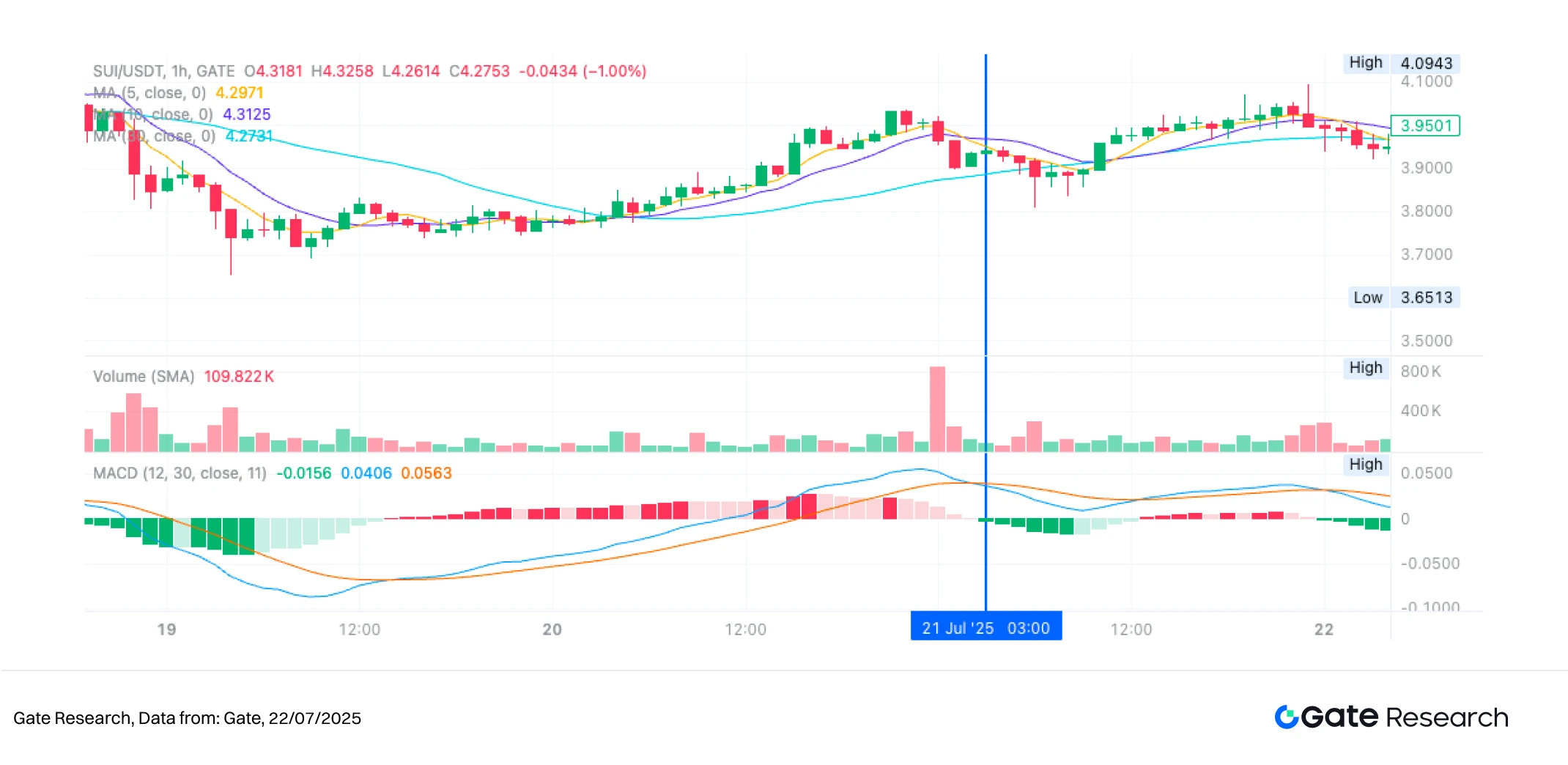 SUI 於 2025 年 7 月 21 日出現 MACD 死叉,程序據此觸發出場信號,執行平倉操作。圖中可見,MACD 綫自上而下跌破信號綫,構成典型的趨勢轉弱信號,同時柱狀圖收斂,顯示動能逐步減弱。盡管價格仍處於短期均綫之上,但漲勢已有所放緩,連續高點未能有效突破,市場動能邊際減弱。成交量亦未出現延續性放大,反映市場追高意願有限。在此背景下,策略基於“MACD 死叉”作為趨勢反轉的前瞻性信號,選擇在上漲動能耗盡前主動出場,鎖定先前區間的部分漲幅。