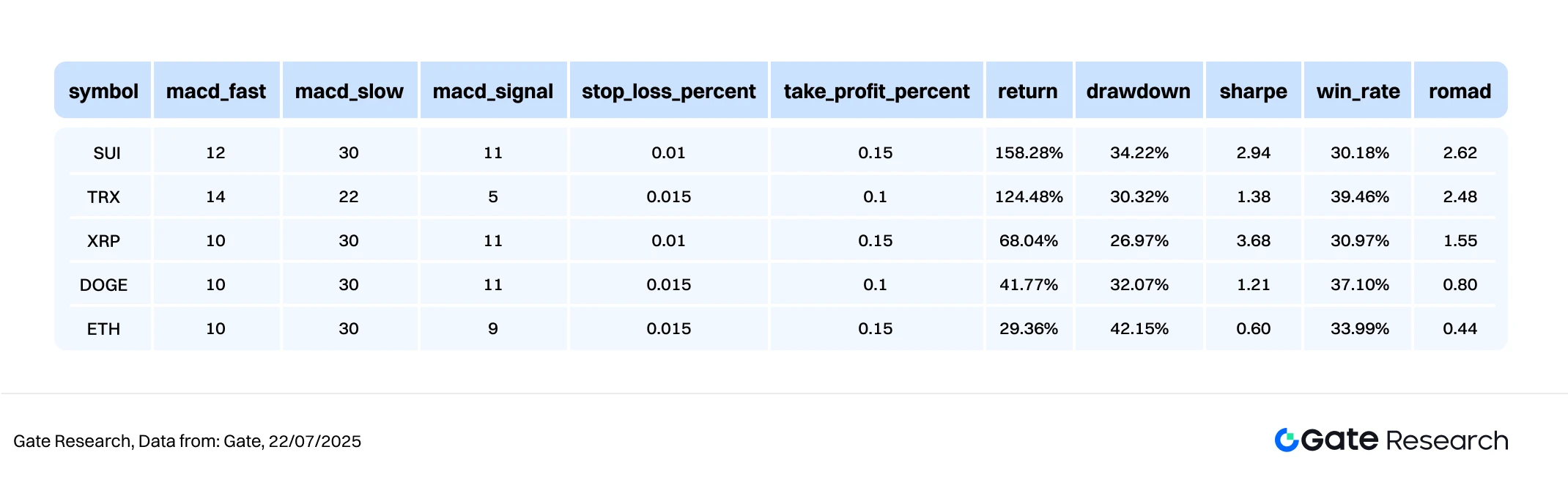 在當前結構偏多但分歧升溫的關鍵節點,短綫策略應更加注重節奏把握與風險控制,靈活結合趨勢工具與倉位管理,在復雜行情中穩健尋找確定性機會。在此背景下,基於 MACD 金叉入場、固定止盈止損出場的趨勢型策略展現出良好的中短期交易優勢。該策略通過動能指標識別行情轉折,並借由明確的進出場邏輯強化風險控制與執行紀律。回測結果顯示,策略在 SUI、TRX 等主流幣種上表現突出,累計收益最高超過 150%,且整體回撤控制良好。