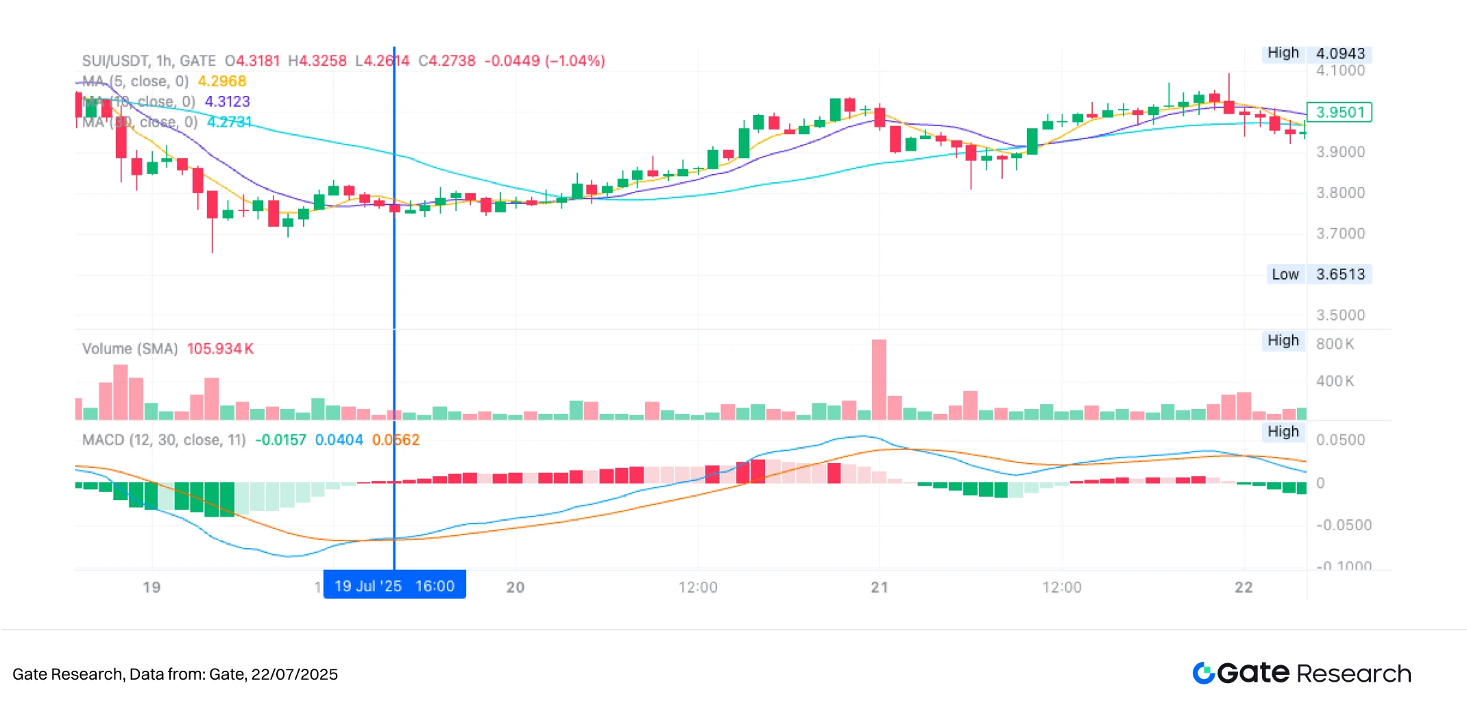 下圖為策略在 2025 年 7 月 19 日觸發進場時的 SUI/USDT 1 小時 K 綫圖。此時 MACD 快綫自下向上突破信號綫,構成標準金叉信號,符合策略中“動能轉強”的多頭建倉條件。同時,價格已站上短期均綫(MA5 與 MA10),顯示短綫結構翻多,短期均綫呈現拐頭上行態勢,進一步加強入場確認。