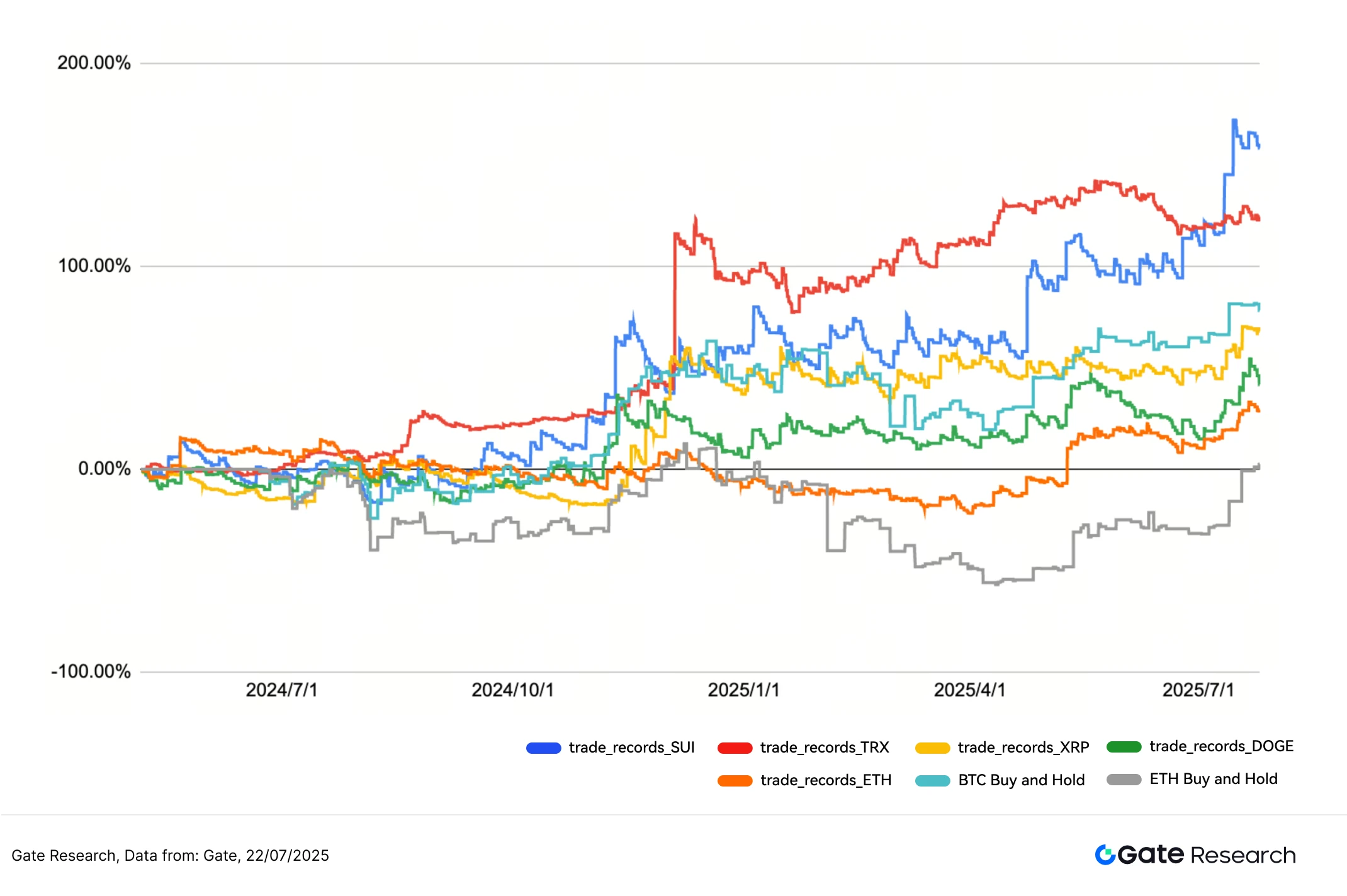 圖中可見,SUI 與 TRX 策略收益曲綫表現最為亮眼,整體走勢持續上揚,累計報酬均超過 100%,多次在趨勢啓動初期進場並順利止盈,展現出良好的趨勢跟隨能力。其中,SUI 策略為長期表現最佳者,自 2024 年 10 月起持續穩步攀升,於 2025 年中創下策略高點,累計收益居各幣種之首。