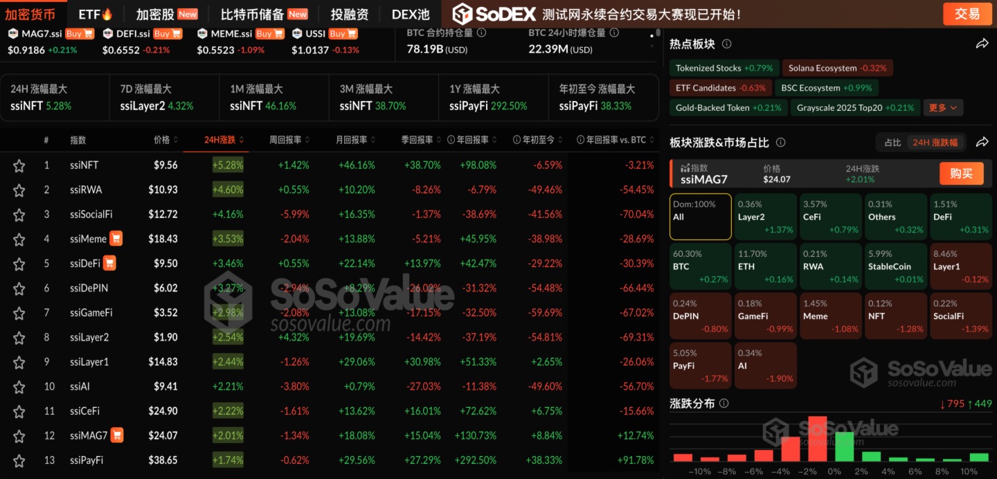 反映板塊歷史行情的加密板塊指數顯示,ssiNFT、ssiRWA、ssiSocialFi 指數分別上漲 5.28%、4.60%、4.16%。