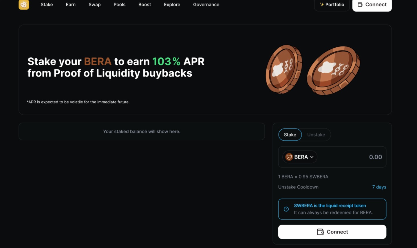 而用戶在進行 BERA 代幣的質押時,則直接質押到 Berachain 的合約中,用戶體驗上類似於 PoS 的單幣質押,而不是委託給驗證者。但這裡需要注意的是,sWBERA 贖回為 BERA 時需要 7 天的解鎖期。