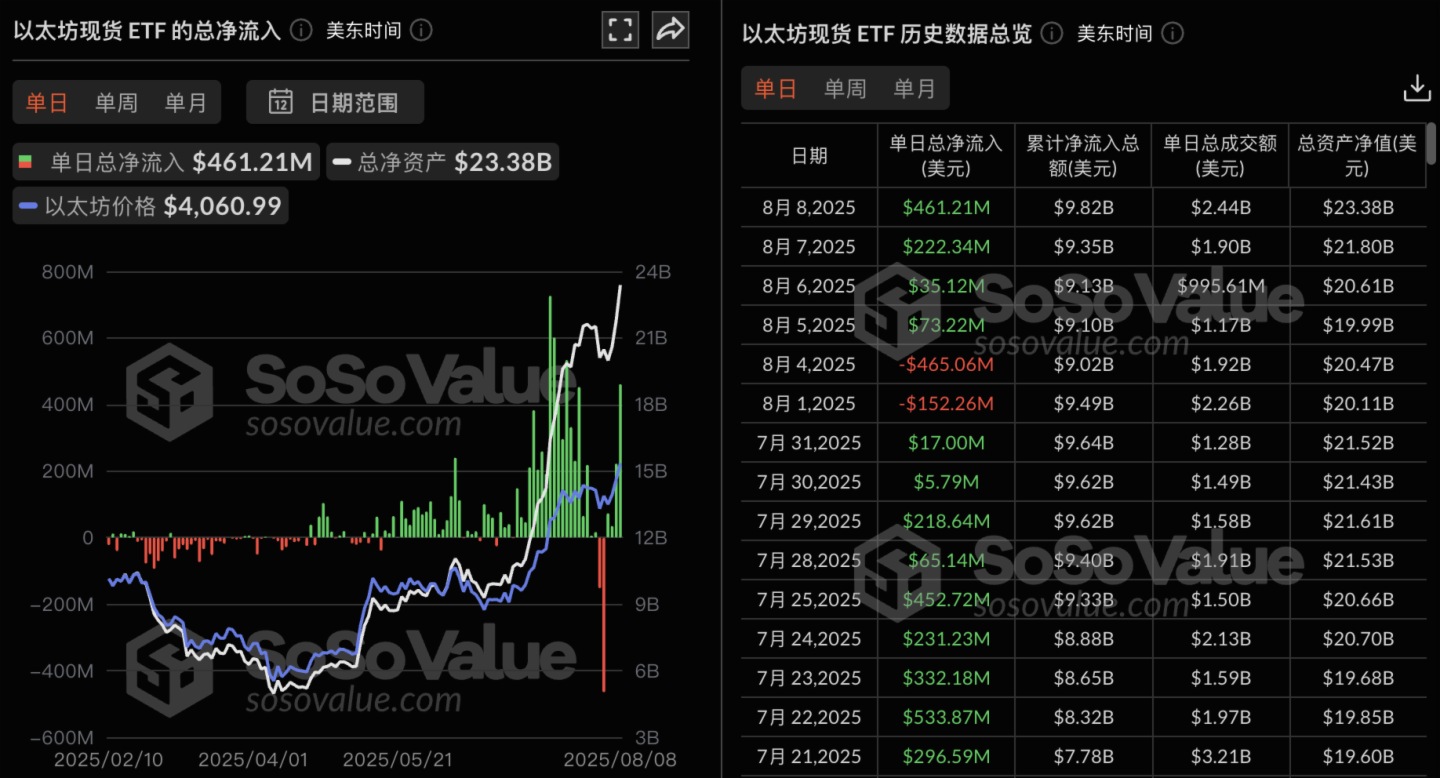 PANews 8月9日消息,根據 SoSoValue 數據,昨日(美東時間 8 月 8 日)以太坊現貨 ETF 總淨流入 4.61 億美元。