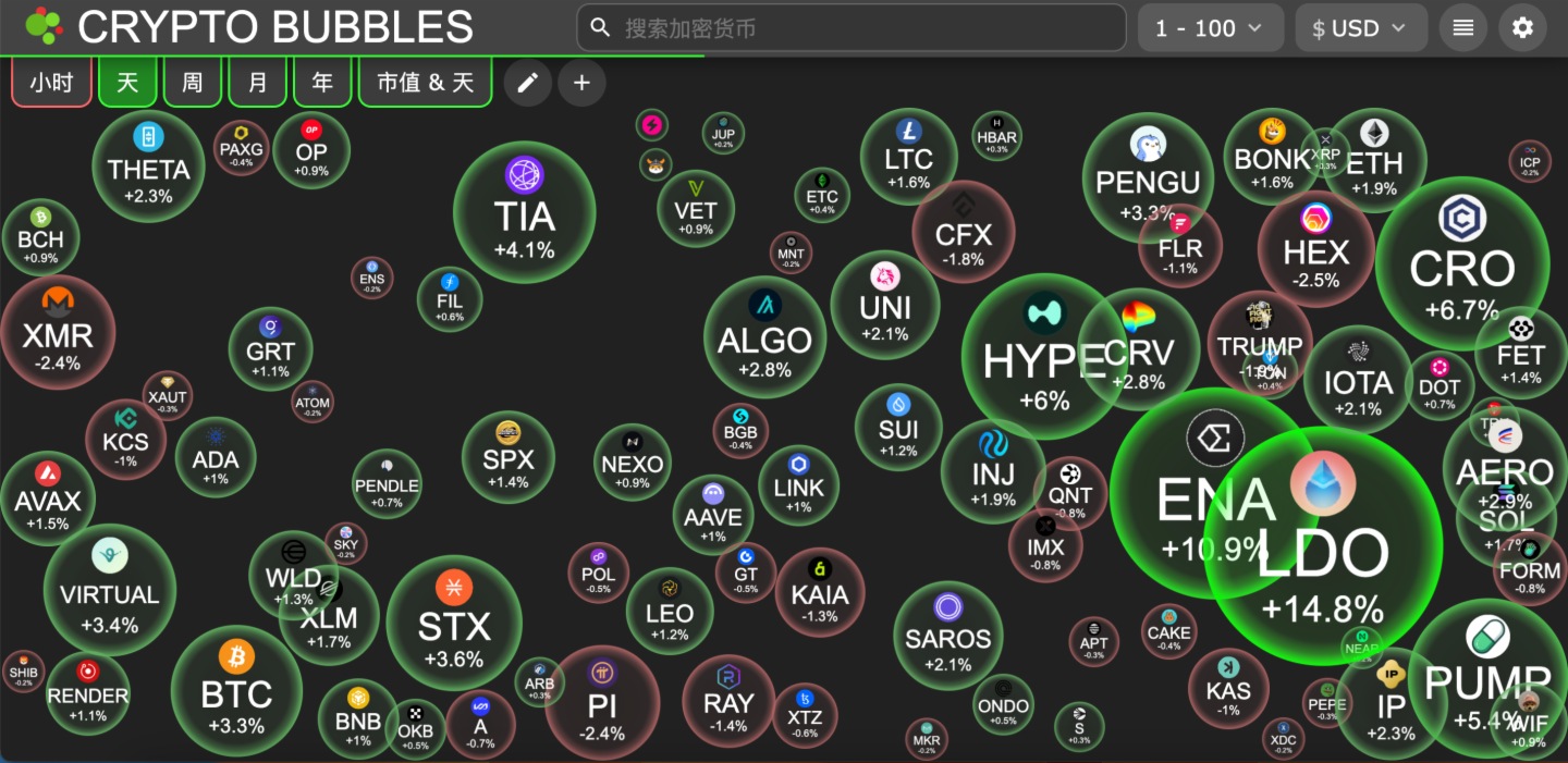 今日市值前100最大漲幅:Lido漲14.8%,Ethena漲10.9%,Cronos漲6.7%,Hyperliquid漲6%,Pump.fun漲5.4%。