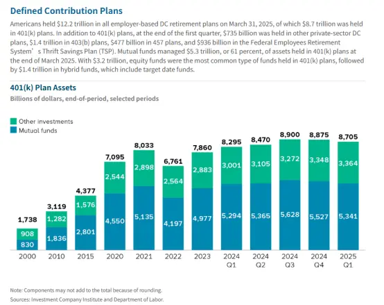盡管401(k)並非全民政策,且顯然難以覆蓋完整的退休資金需求,但考慮到將近6成美國家庭擁有401(k),這一計劃已然成為了美國養老制度的核心所在。這筆資金,自然也相當可觀。發展至如今,根據公開數據顯示,截至2025年3月31 日,所有僱主主導的繳費確定型(DC)退休計劃總資産已高達 12.2 萬億美元。其中,401(k) 計劃持有8.7萬億美元。