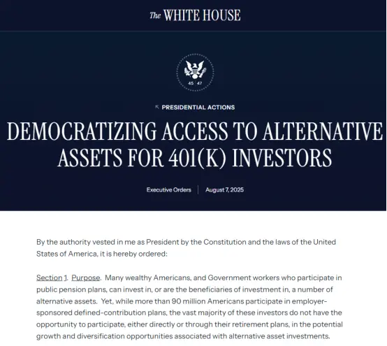 來到2025年,這一限制被進一步打破。就在當地時間8月7日,特朗普簽署了一項行政命令,允許美國人的401(k)計劃投資私募股權基金、比特幣等加密貨幣以及其他所謂的另類資産。特朗普還要求勞工部長Lori Chavez-DeRemer與財政部、證券交易委員會(SEC)及其他聯邦監管機構的對口官員合作,確定是否應修改規則來協助這項工作,並指示SEC為參與者自主投資的養老金計劃提供納入另類資産的便利。