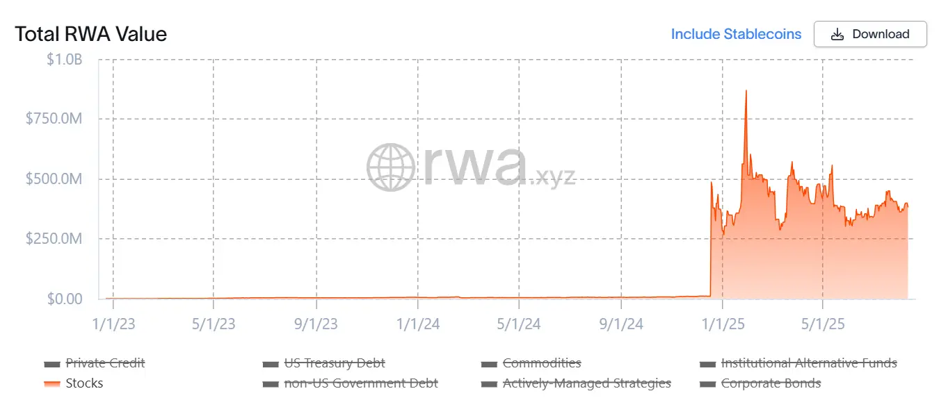 rwa.xyz 數據顯示,今年以來,股票類代幣化資産的規模已從幾乎為零躍升至數億美元,背後則是股票代幣化正從概念加速走向落地——經歷了從合成資産到實股託管的模式演進,並正向衍生品等更高階形態延伸。