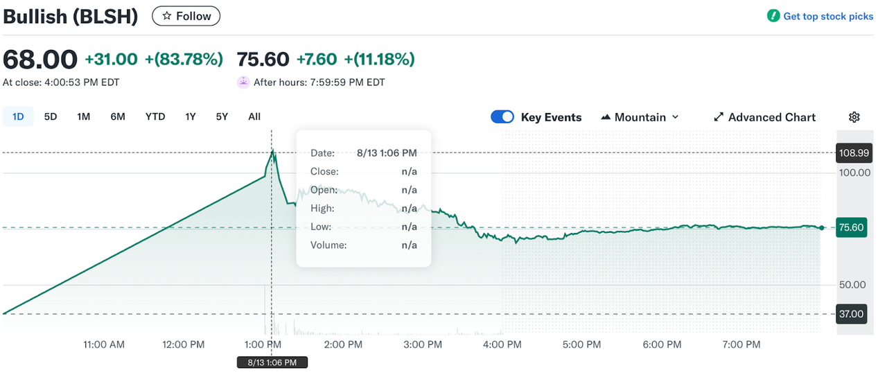 Bullish股價激增超150% 此次成功的IPO是加密貨幣交易所在美國罕見的上市案例,也是近期數字資産領域企業取得成功的延續。 IPO Boutique高級研究分析師傑夫·澤爾(Jeff Zell)表示:“Bullish提供了頗具吸引力的初始估值,投資者在IPO前積極參與競價。” 誰是Bullish及其重要性 Bullish由包括彼得·泰爾創辦的創始人基金、野村證券(Nomura)以及Galaxy Digital等知名機構於2020年共同創立。2022年取消SPAC合並後,該公司第二次嘗試上市。 前紐約證券交易所總裁湯姆·法利(Tom Farley)將擔任Bullish董事長,憑借其深厚的市場結構專業知識領導公司。他在機構客戶中的信譽將成為加密貨幣交易所激烈競爭中的關鍵優勢。Bullish主要服務於機構客戶,其加密貨幣持有量預計將隨著新法規的出台而增長。 Bullish於6月向摩根大通和傑富瑞秘密提交IPO申請,並成功獲批。此次上市正值投資者對數字資産信心高漲之時。Circle Internet Group也取得類似成功,其股價在上市後飙升超過500%。Gemini、Grayscale、Figure Technology和BitGo等公司也在積極籌備上市。