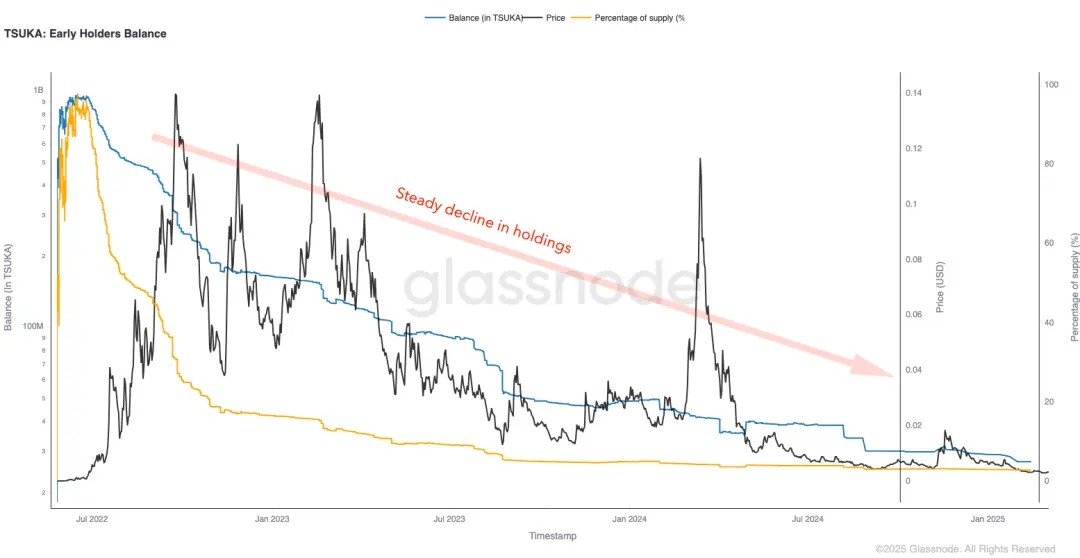 圖3↓顯示TSUKA早期持幣者的持倉呈漸進式減少,異於前例的突發抛售: